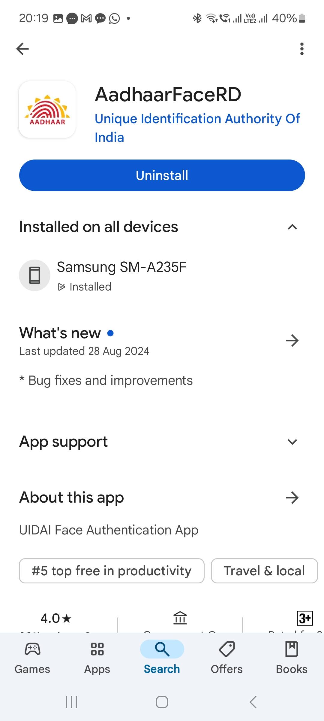 - त्यानंतर AadhaarFaceRD (सर्च मध्ये बरोबर असेच type करा) हे अॅप install करा.